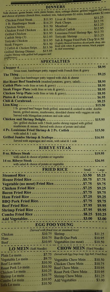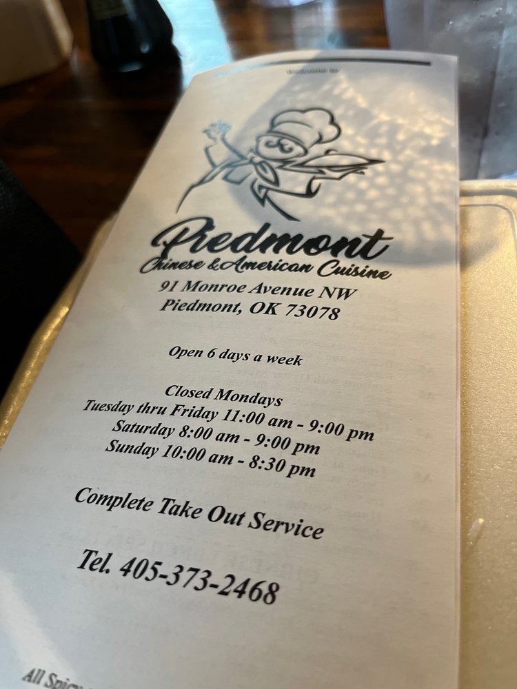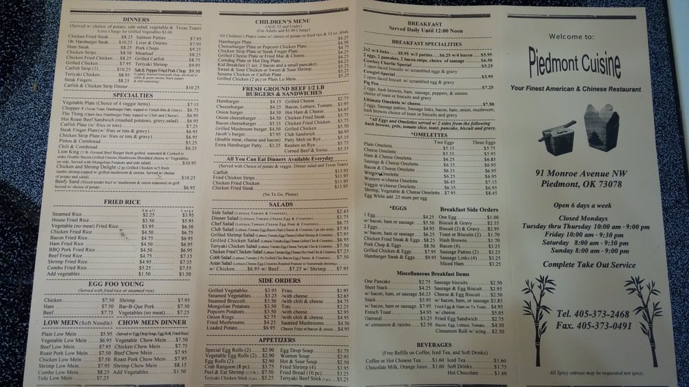 Piedmont Cuisine, located at 91 Monroe Ave NE Piedmont, OK 73078, offers a diverse menu ranging from Chinese dishes to seafood. The restaurant provides takeout, delivery, and catering services, ensuring convenience for customers. Customers rave about the generous portion sizes, friendly service, and delicious flavors. The Pork Egg Foo Yung and Teriyaki Chicken Salad are highly recommended dishes, with the Mongolian beef standing out for its flavorful taste and tender meat. The menu offers a wide variety of options, appealing to both Chinese cuisine enthusiasts and those looking for classic American diner fare. With welcoming vibes and a cute ambiance, Piedmont Cuisine is a local favorite worth visiting for breakfast, lunch, or dinner.